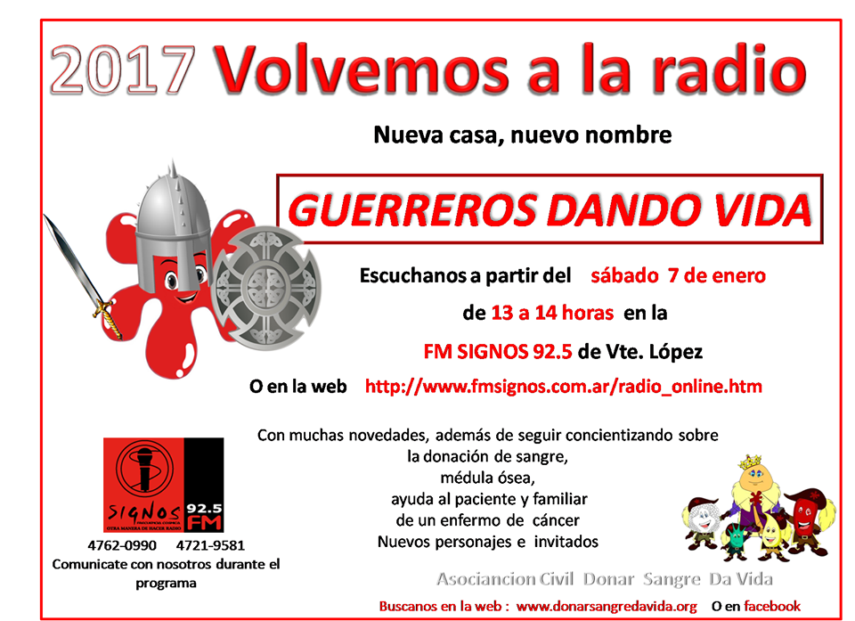 A las 13hs NUEVO PROGRAMA "Guerreros Dando Vida" por FM SIGNOS 92.5