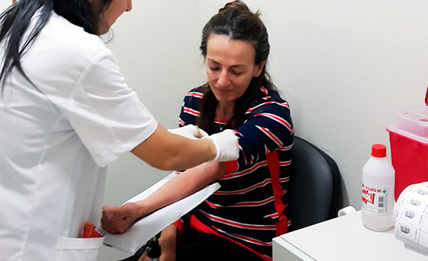 Finalmente, se evalúa la condición física del donante (medición de la temperatura corporal, la tensión arterial y el nivel de hemoglobina para establecer que las reservas de glóbulos rojos sean suficientes), y si se encuentra apto se realiza la extracción de sangre.